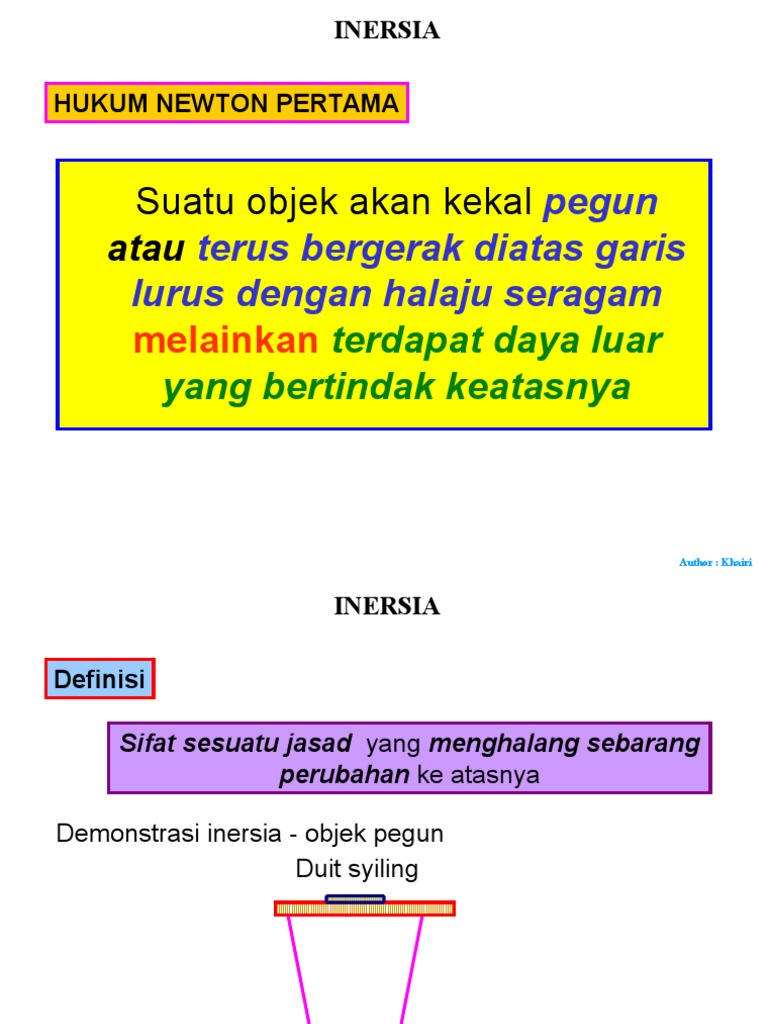 Inertia adalah nama kecenderungan sesuatu objek yang bergerak untuk terus bergerak atau benda yang sedang berehat untuk tetap berehat kecuali bertindak oleh daya. 32 Menulis laporan amali. Menyiasat hubungan antara inersia dan jisim.