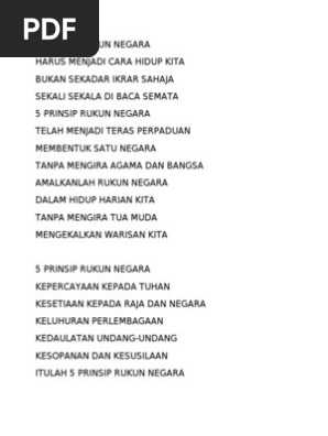 Mencipta satu masyarakat yang adil di mana kemakmuran negara akan dapat dinikmati secara adil dan saksama. 5 Prinsip Rukun Negara online worksheet for YEAR 6. The Rukunegara or sometimes Rukun Negara Malay for National Principles is the Malaysian declaration of national philosophy instituted by royal proclamation on Merdeka Day 1970 in reaction to a serious race riot known as the May 13 Incident which occurred in 1969.