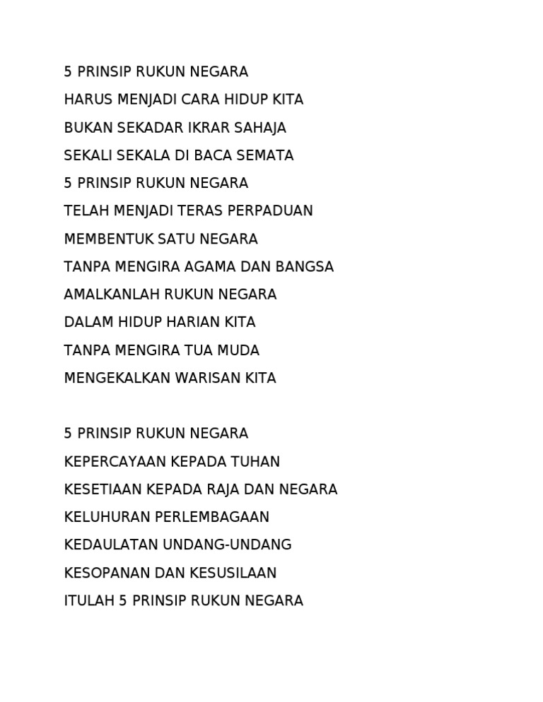 5 prinsip rukun negara in english. Majlis Keselamatan Negara Rukun Negara Adalah Ideologi Dan Falsafah Yang Punya Makna Mendalam Berteraskan Lima Prinsip 1 Kepercayaan Kepada Tuhan 2 Kesetiaan Kepada. The Rukun Negara National Principles was introduced on 31 August 1970 by the Malaysian Government to celebrate the 13th anniversary of the nations independence Hari Merdeka. Kesetiaan Kepada Raja dan Negara.