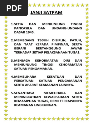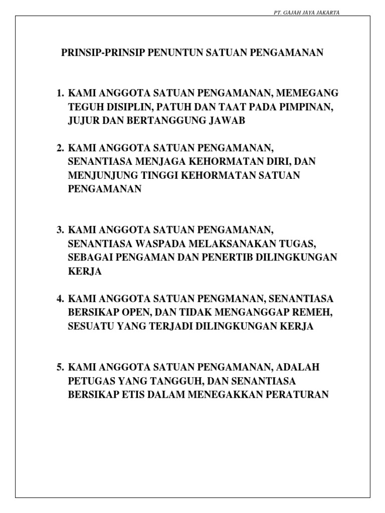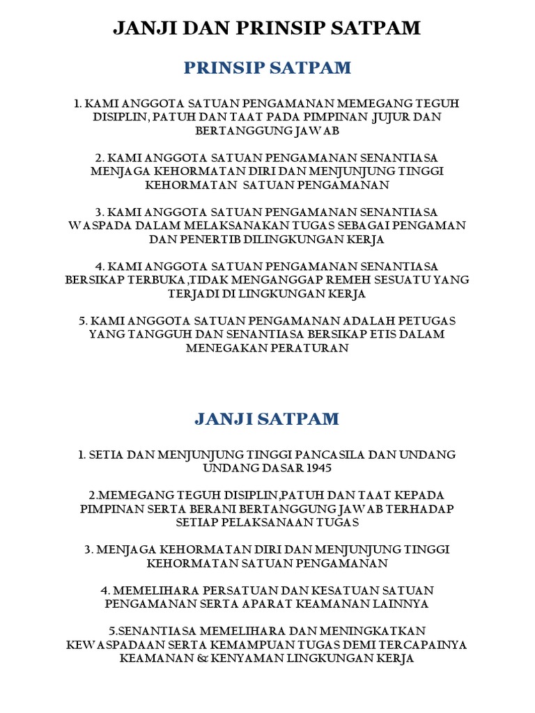 Kami anggota satuan pengamanan memegang teguh disiplin patuh dan taat pada pimpinan jujur dan bertanggung jawab. Unknown 2 Januari 2014 0338. Prinsip-prinsip penuntun satuan pengaman satpam april 11 2017 1.