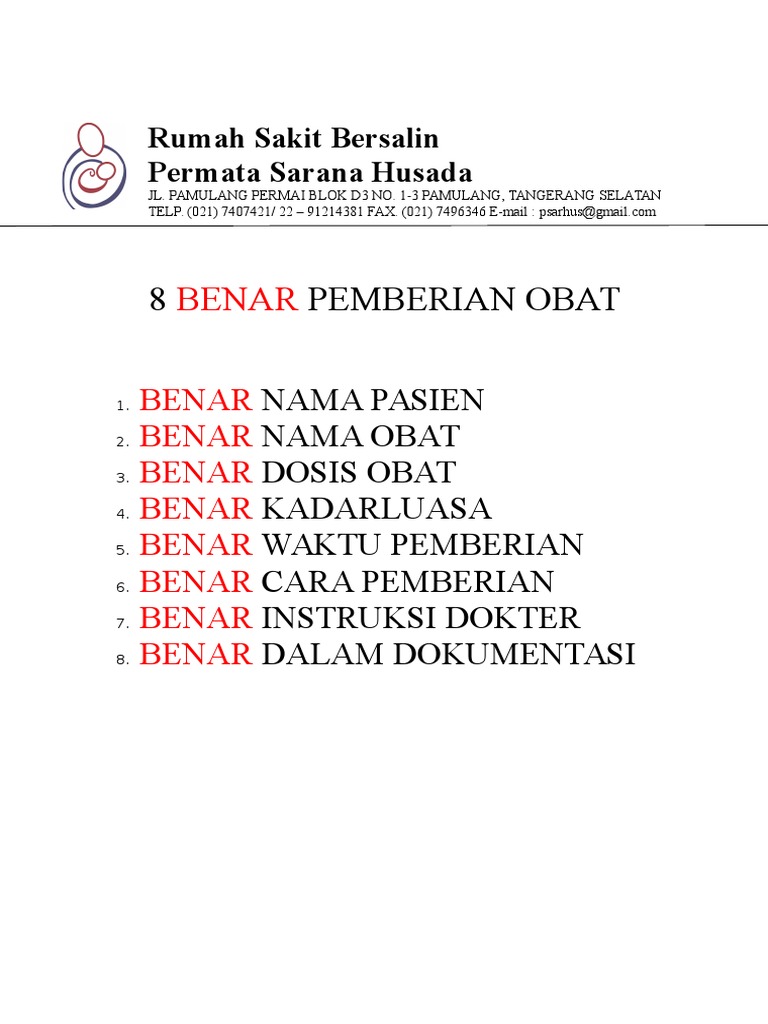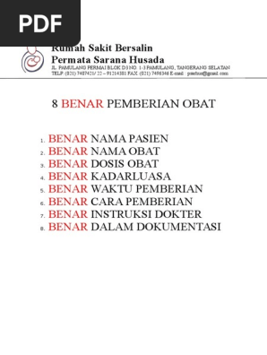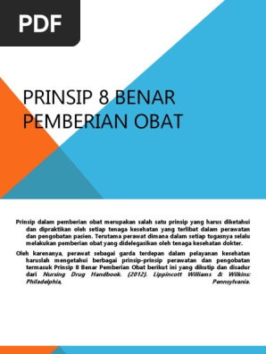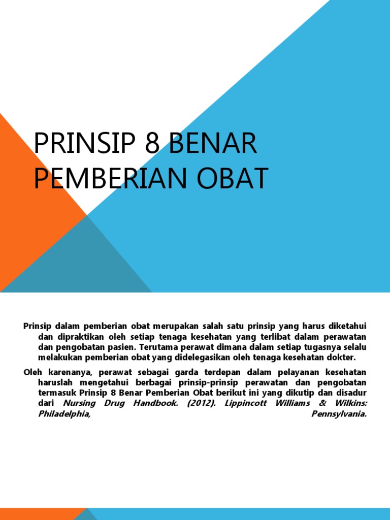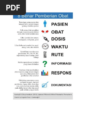 Perawat dituntut tepat dan terampil dalam memberikan obat tidak sekedar memberikan Lanjutkan membaca Prinsip 12 Benar Pemberian Obat. Berikut ini Prinsip 8 Benar Pemberian Obat yang dikutip dan disadur dari Nursing Drug Handbook. Prinsip 6 Benar 1 Benar Pasien - Sebelum obat diberikan periksa identitas pasien papan identitas gelang identitas nama jenis kelamin umur dan Nomor Rekam Medik - Jika pasien tidak mampu melakukan identifikasi libatkan keluarga - Sampaikan tujuan pemberian obat pasien dapat berhak menolak.