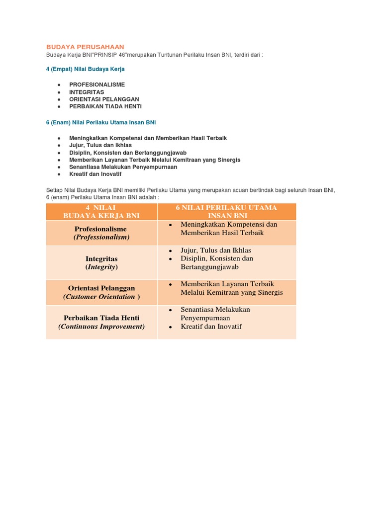 Bank Negara Indonesia sebagai pilihan tempat penyimpanan segala alat kekayaan yang terpercaya. BNI Corporate Culture is known as Prinsip 46 which consists of 4 Workplace Values that correspond closely with 6 Core Behavioral Value. Simbol 46 Angka 46 merupakan simbolisasi tanggal kelahiran BNI sekaligus mencerminkan warisan sebagai.