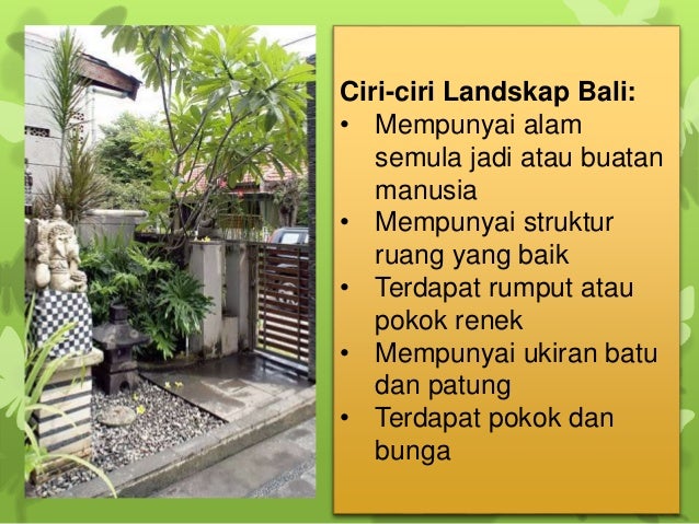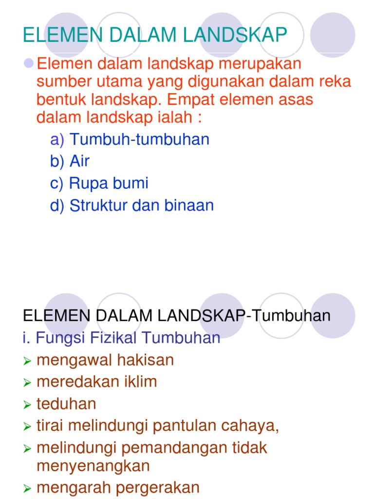 A Elemen dalam landskap merujuk kepada tanah pamah gunung-ganang bukit bukau sungai lembah air terjun dan tasik. Reka Bentuk Landskap Landskap di negara kita. Prinsip-prinsip ini telah diterima umum sebagai asas yang perlu difikirkan sebelum mereka bentuk sesuatu kawasan landskap.