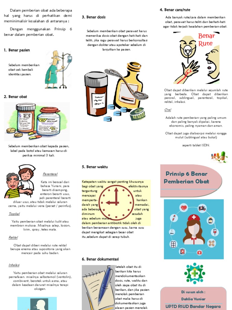Pemberian obat adalah salah satu unsur penting dalam upaya penyembuhan penyakit dan pemulihan kesehatan. Benar Pasien Identitas Benar Obat Benar Dosis Benar Rute Benar Waktu Benar Dokumentasi Benar. Waspadai nama obat yang mirip dan terdengar mirip.