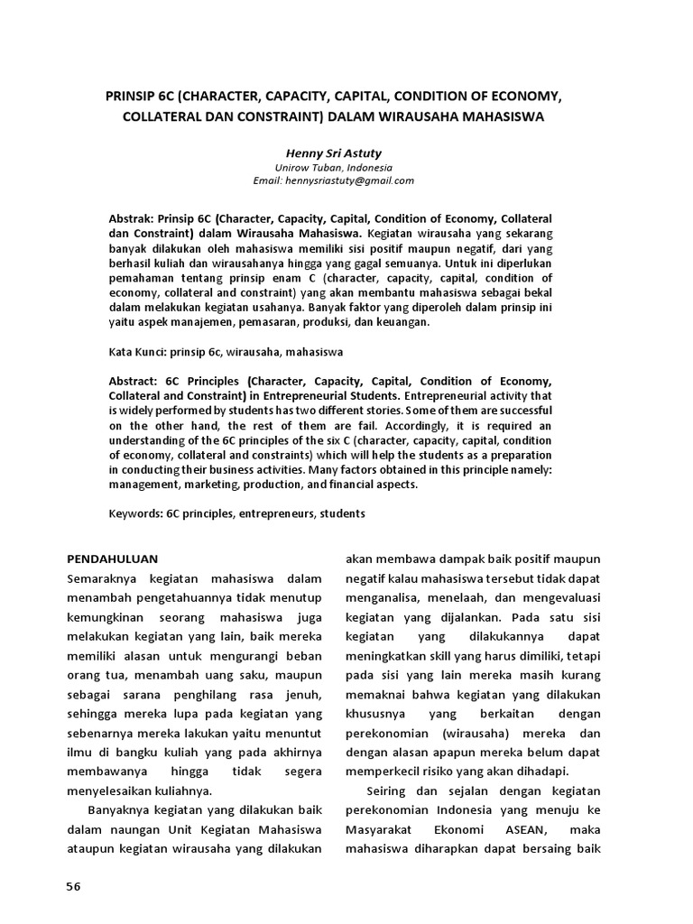 Prinsip 6C ini pada dasarnya sering digunakan oleh dunia perbankan tetapi semua kegiatan perekonomian tidak akan lepas dari bank sehingga dipandang perlu untuk mengadopsi prinsip ini dalam kegiatan wirausaha mahasiswa. Ada beberapa konsep yang menjadi prinsip dalam pemberian kredit yang dikenal dengan prinsip 5C dan 7P. 2 There is a positive relationship between the development of the 3R and 6C.